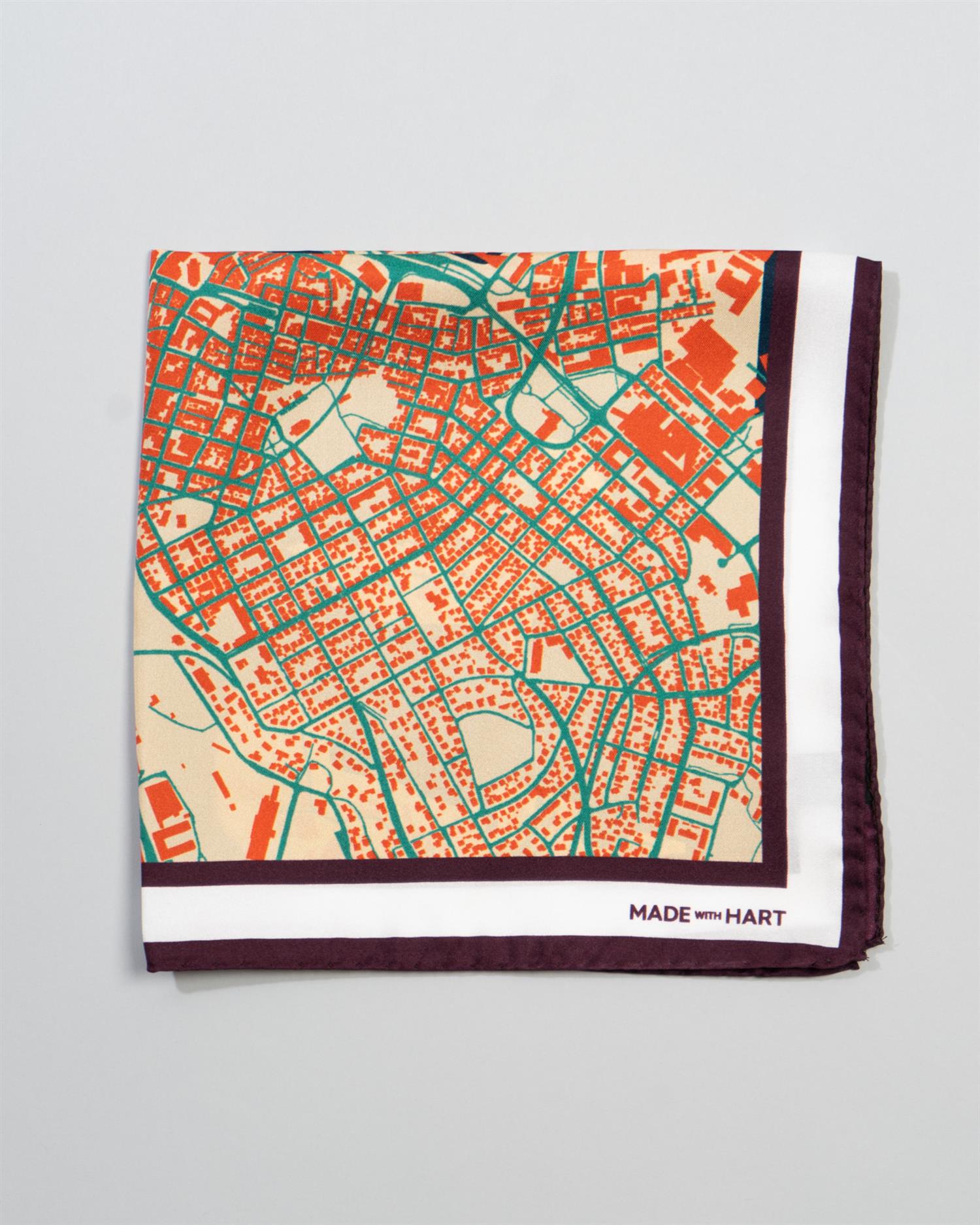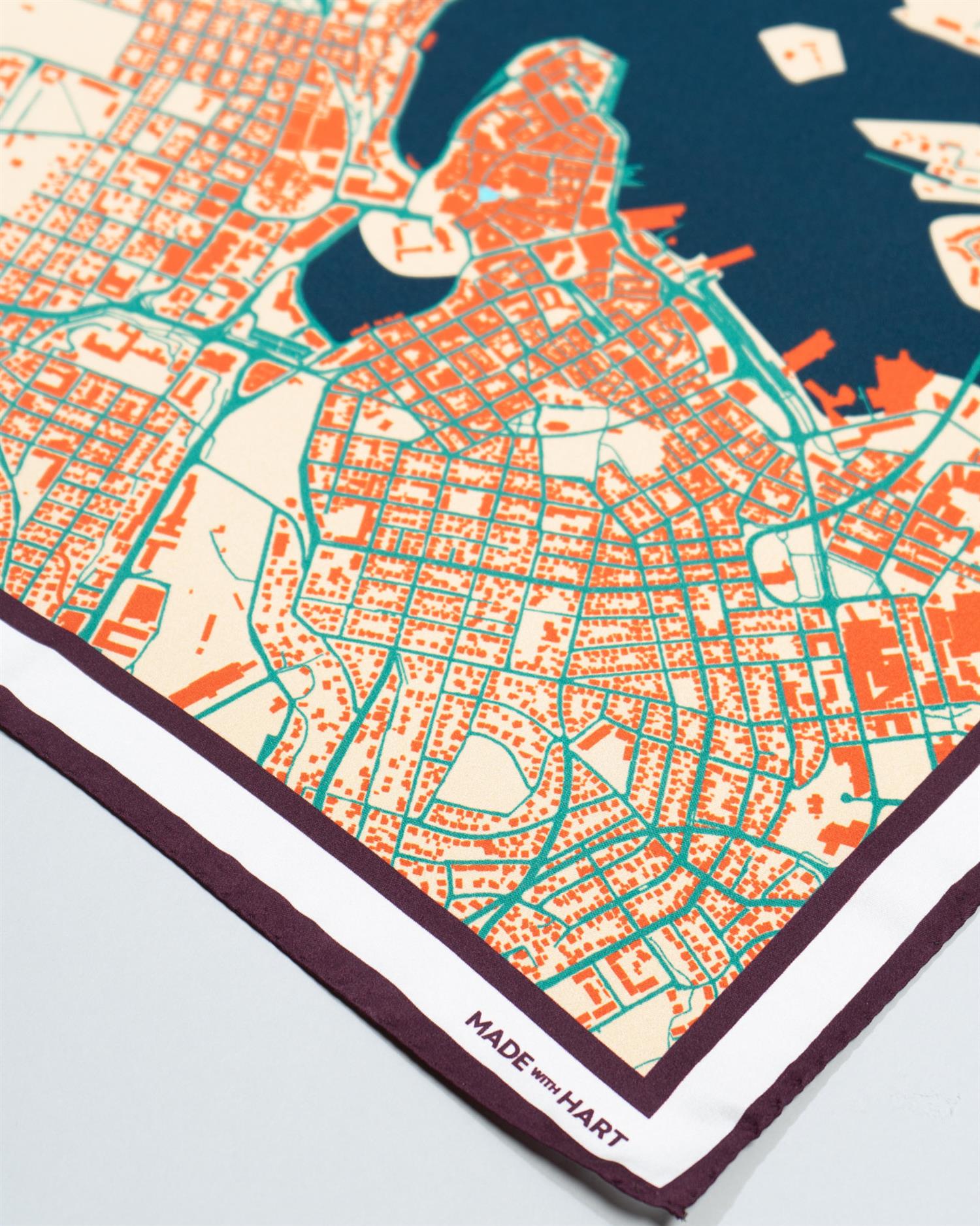 Lommetørklærne med kartet av Stavanger er designet som en hyllest til byen der alt begynte, til gatene, havnen og alle øyeblikkene som utgjør tilværelsen her.
