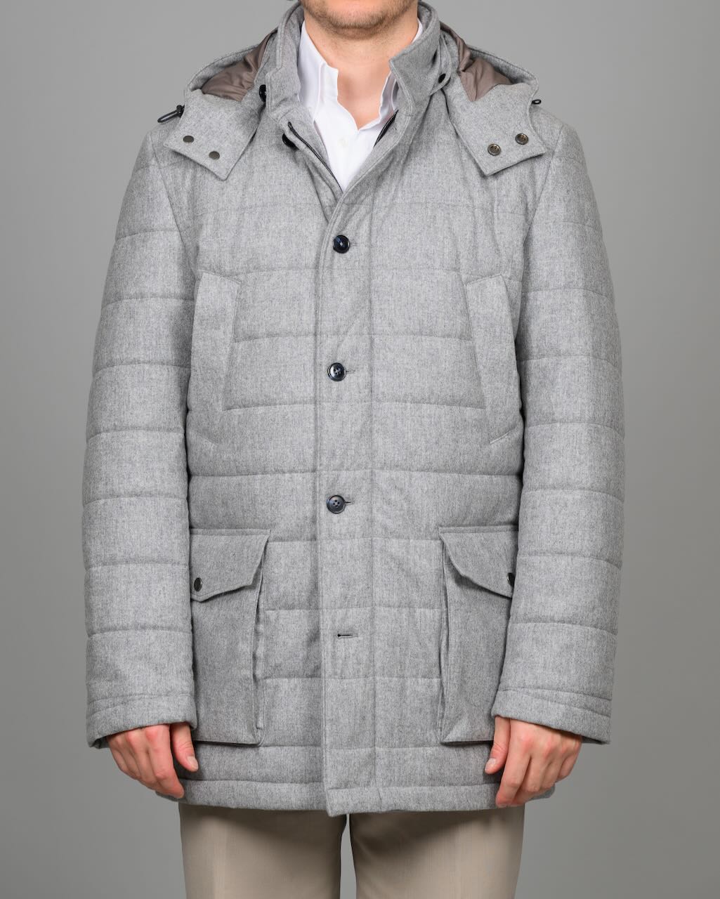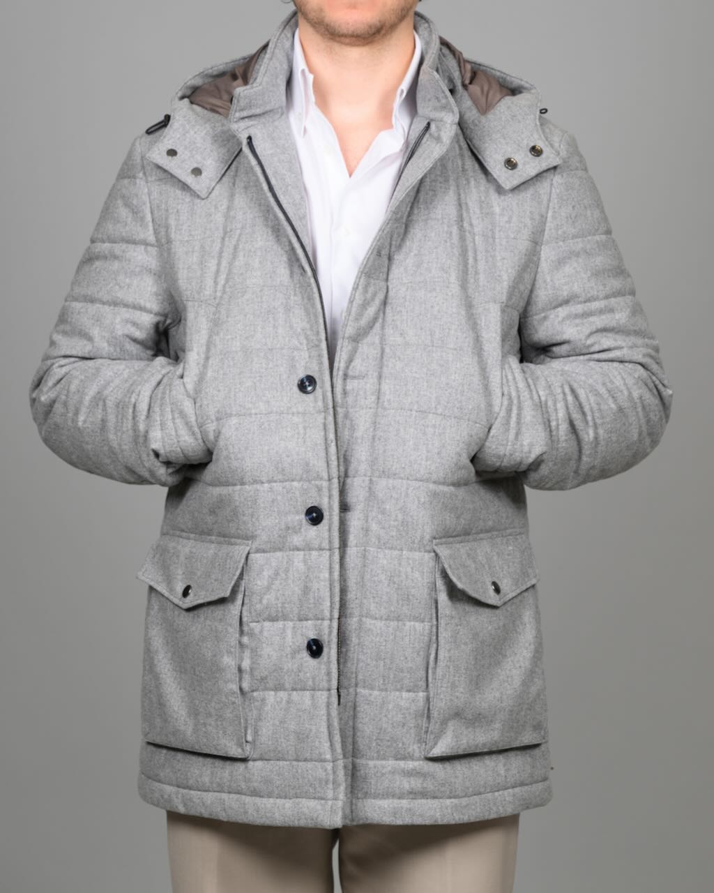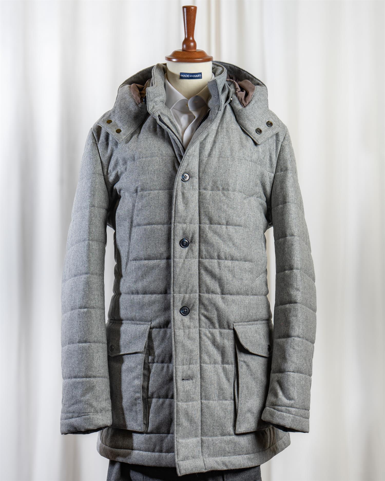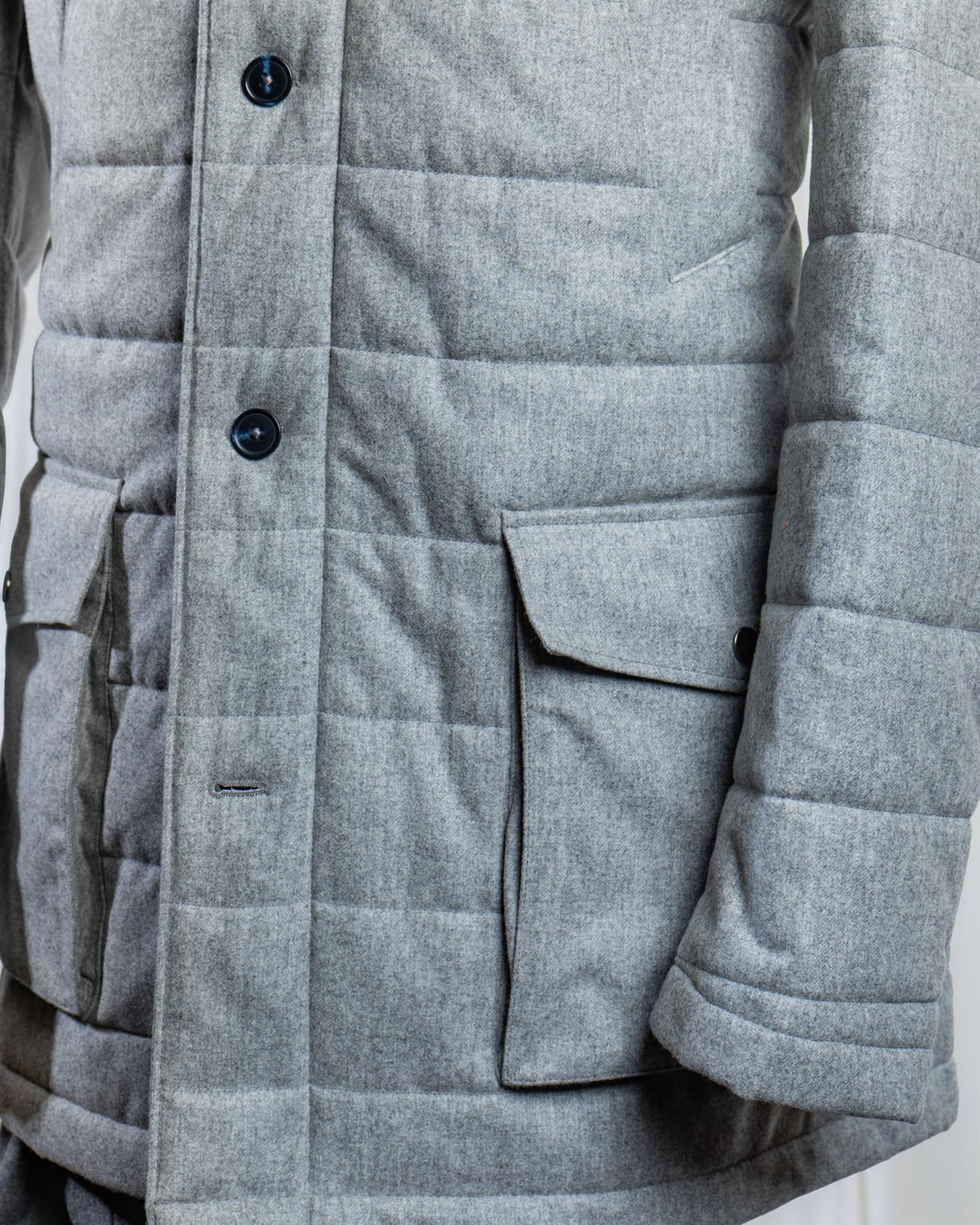 Vattert parka vinterjakke i vannavvisende ullflanell fra Vitale Barberis Canonico 1663, med ull fra NATIVA™.
