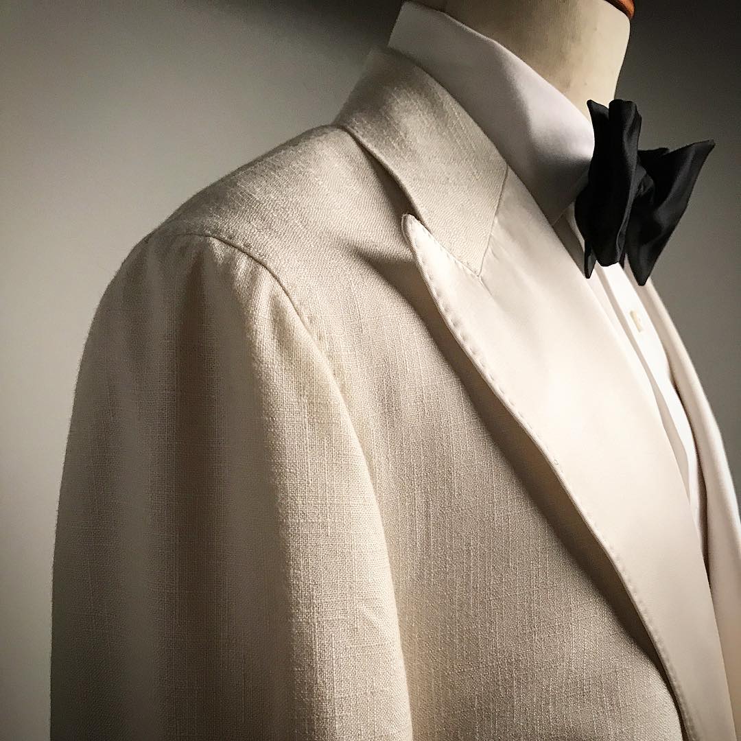 Enkeltspent jakke i myk halv-kanvas, uten skulderputer. "Self-facing" uten silkedetaljer og ekstra brede jakkeslag med spiss.