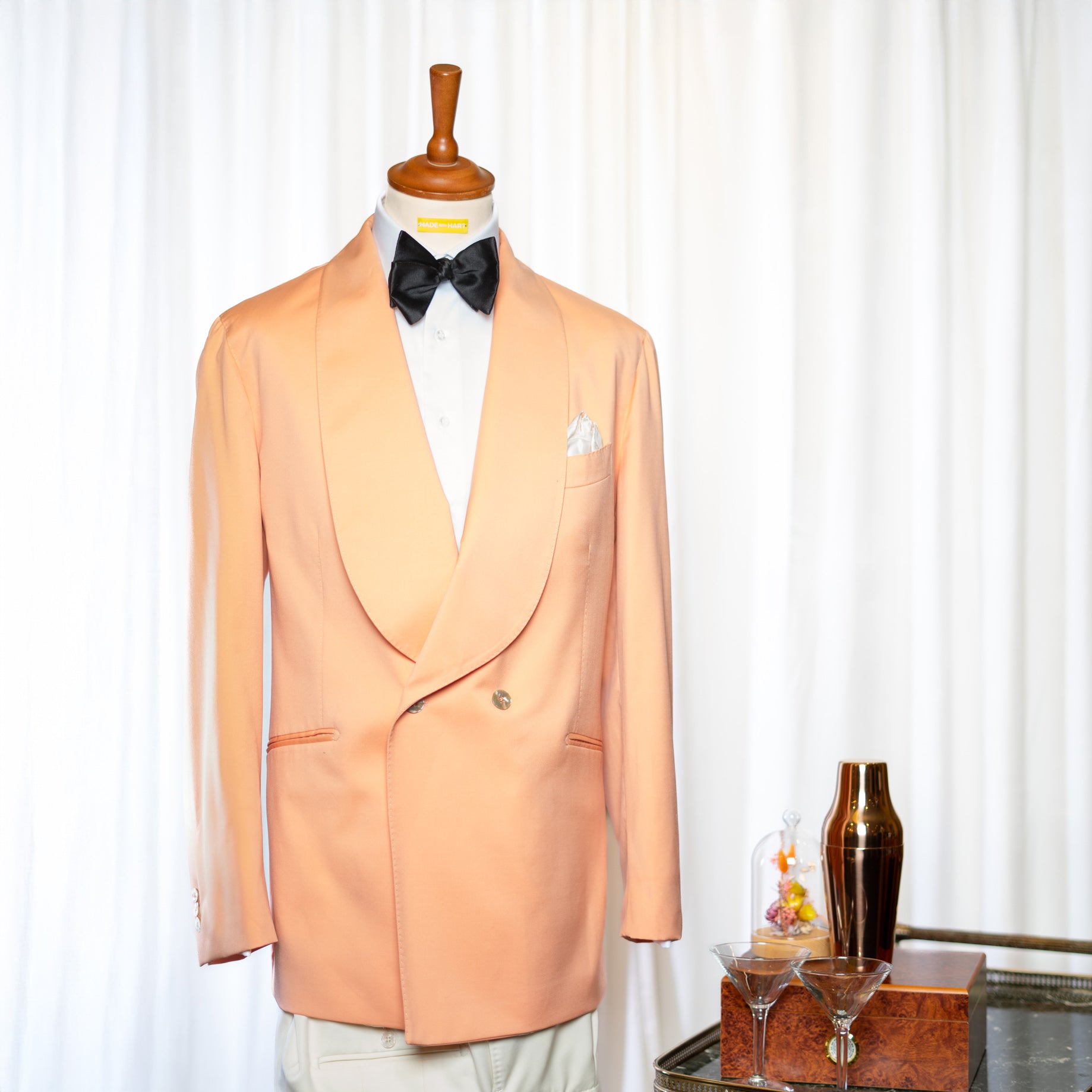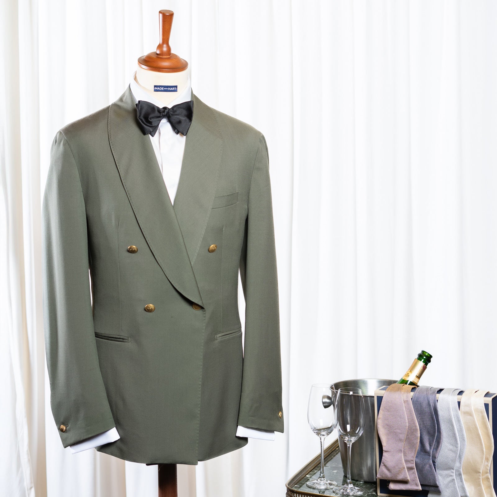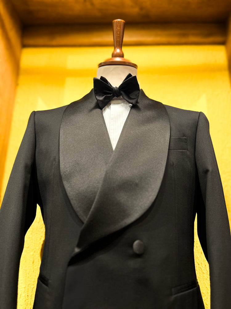 Dobbeltspent 4x1 jakke i myk full-kanvas, med sjalskrage og knapper i messing. Helfôret med Cupro Bemberg.
