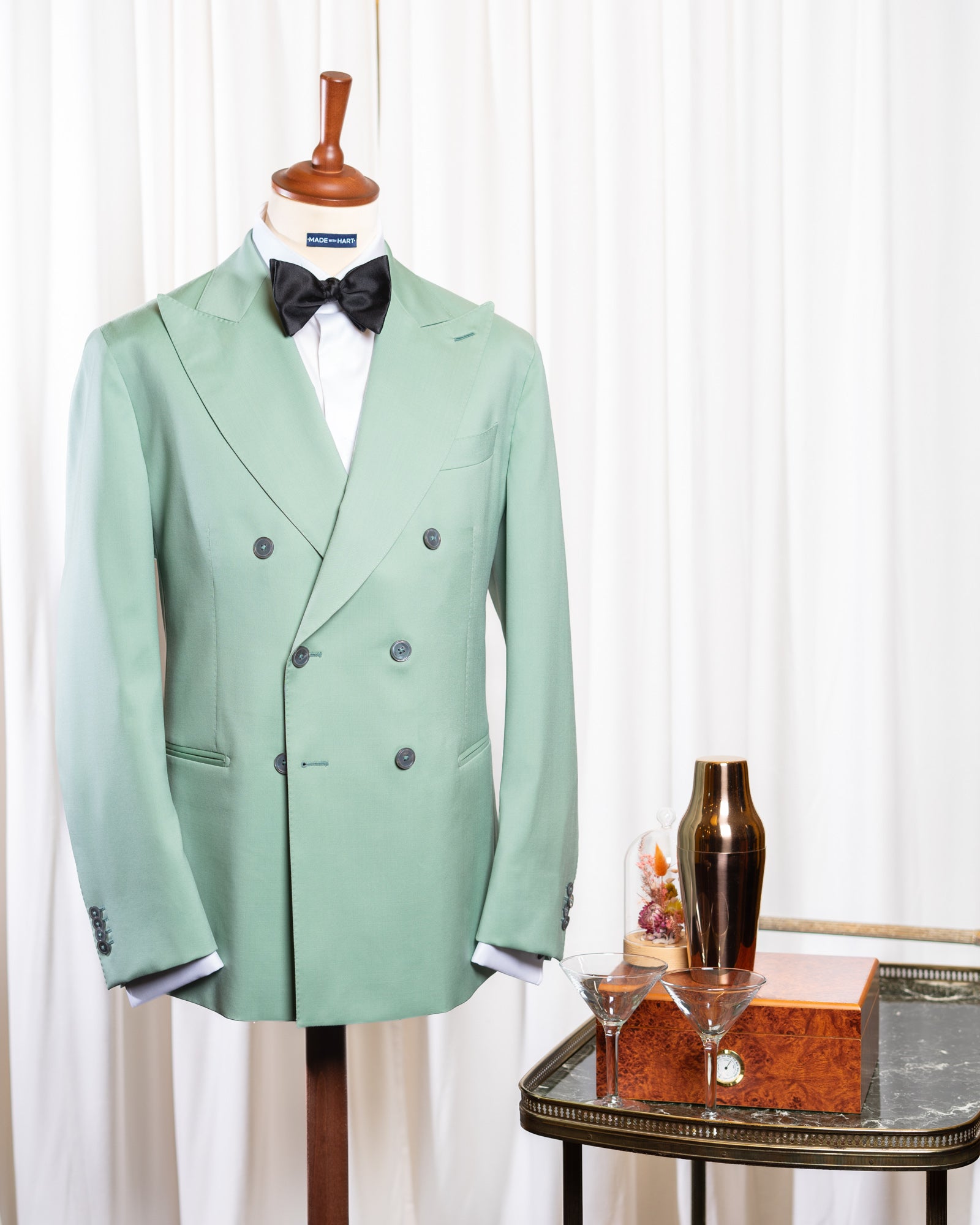 Dobbeltspent jakke med 6x2 knepping i myk halv-kanvas og ustrukturerte skuldre. Ekstra brede jakkeslag med spiss, uten silke. Knapper i perlemor og passpolerte lommer.